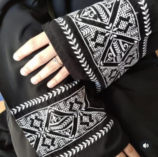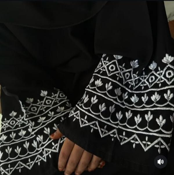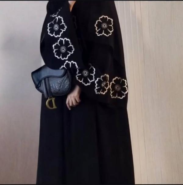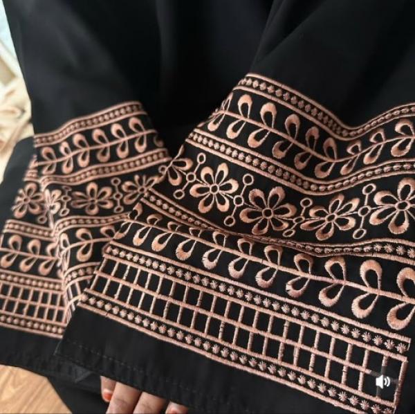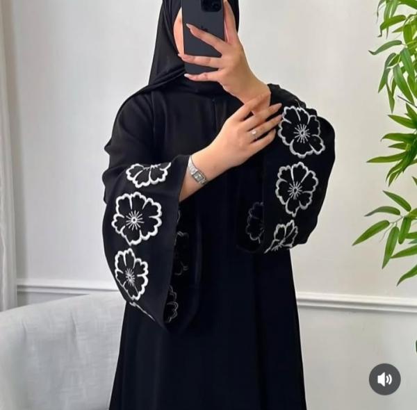 Abaya Made from premium Korean Prada fabric, this front-open abaya features tack buttons, elegant floral embroidery, and stylish cut sleeves.